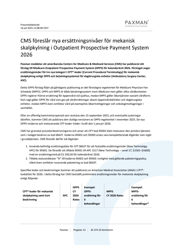Paxman meddelar att amerikanska Centers for Medicare & Medicaid Services (CMS) har publicerat sitt förslag till Medicare Outpatient Prospective Payment System (OPPS) för kalenderåret 2026. Förslaget anger ersättningsnivåer för tre nya kategori I CPT®-koder (Current Procedural Terminology) för mekanisk skalpkylning enligt OPPS och betalningssystemet för dagkirurgiska enheter (Ambulatory Surgery Center, ASC).