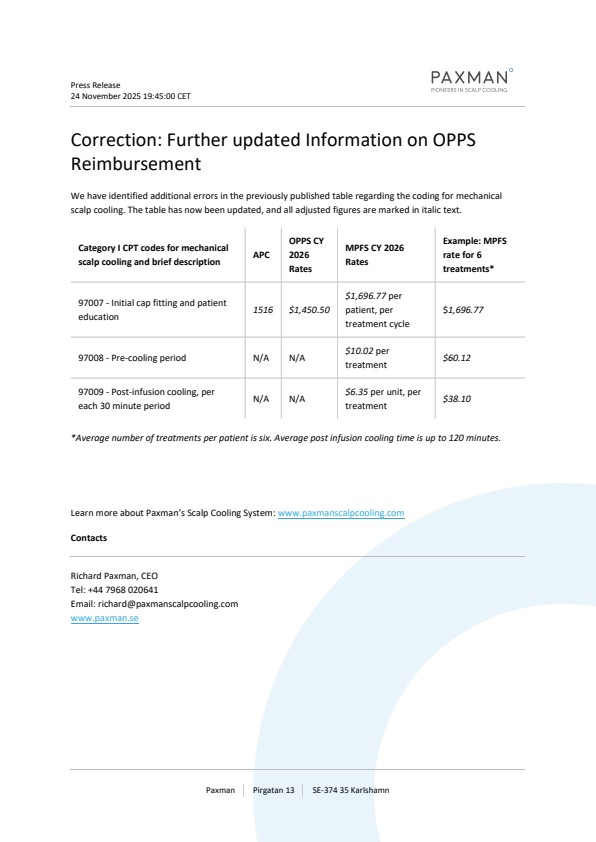 We have identified additional errors in the previously published table regarding the coding for mechanical scalp cooling. The table has now been updated, and all adjusted figures are marked in italic text.