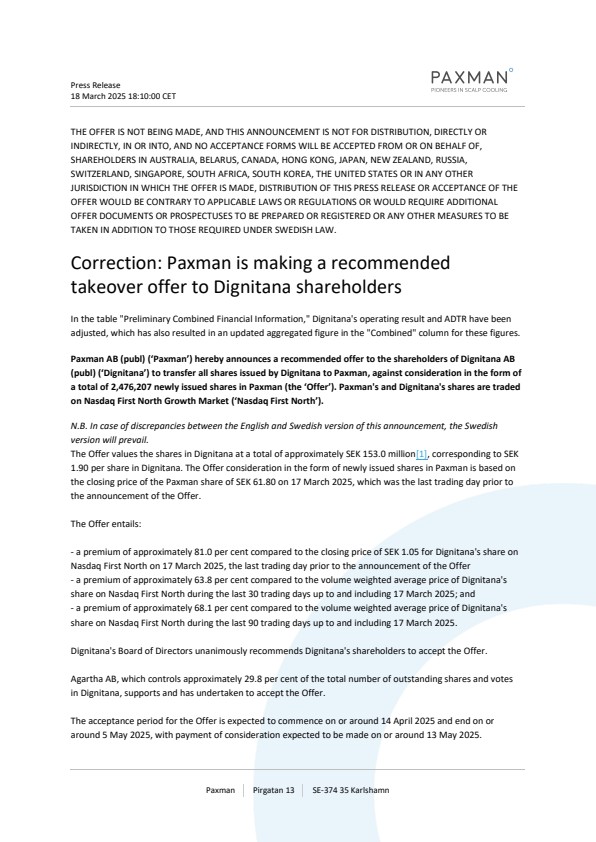 The Offer values the shares in Dignitana at a total of approximately SEK 153.0 million[1], corresponding to SEK 1.90 per share in Dignitana. The Offer consideration in the form of newly issued shares in Paxman is based on the closing price of the Paxman share of SEK 61.80 on 17 March 2025, which was the last trading day prior to the announcement of the Offer.