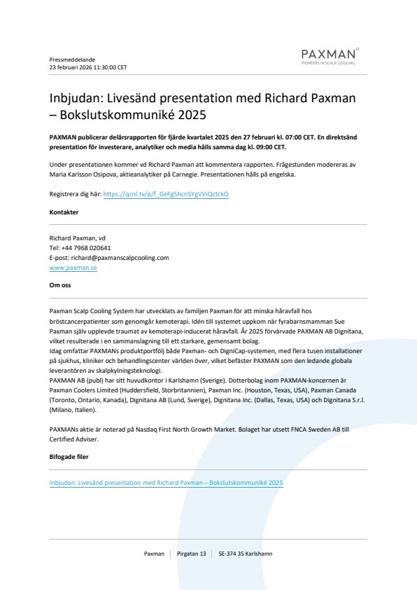 PAXMAN publicerar delårsrapporten för fjärde kvartalet 2025 den 27 februari kl. 07:00 CET. En direktsänd presentation för investerare, analytiker och media hålls samma dag kl. 09:00 CET.