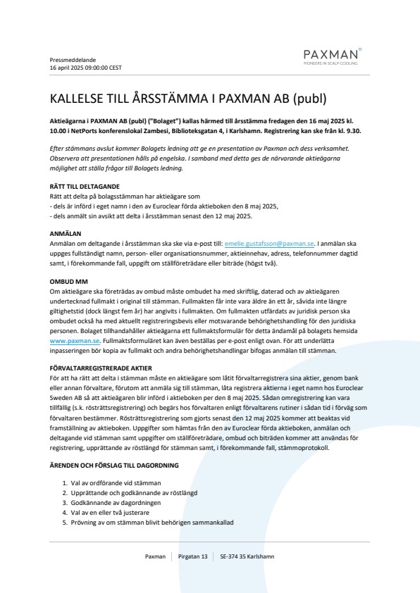 Aktieägarna i PAXMAN AB (publ) (”Bolaget”) kallas härmed till årsstämma fredagen den 16 maj 2025 kl. 10.00 i NetPorts konferenslokal Zambesi, Biblioteksgatan 4, i Karlshamn. Registrering kan ske från kl. 9.30.
