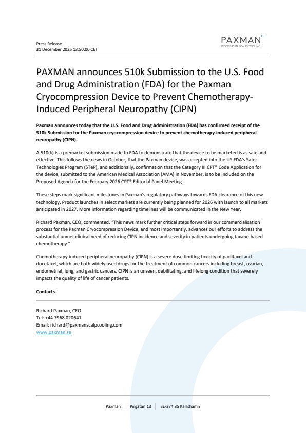 Paxman announces today that the U.S. Food and Drug Administration (FDA) has confirmed receipt of the 510k Submission for the Paxman cryocompression device to prevent chemotherapy-induced peripheral neuropathy (CIPN).