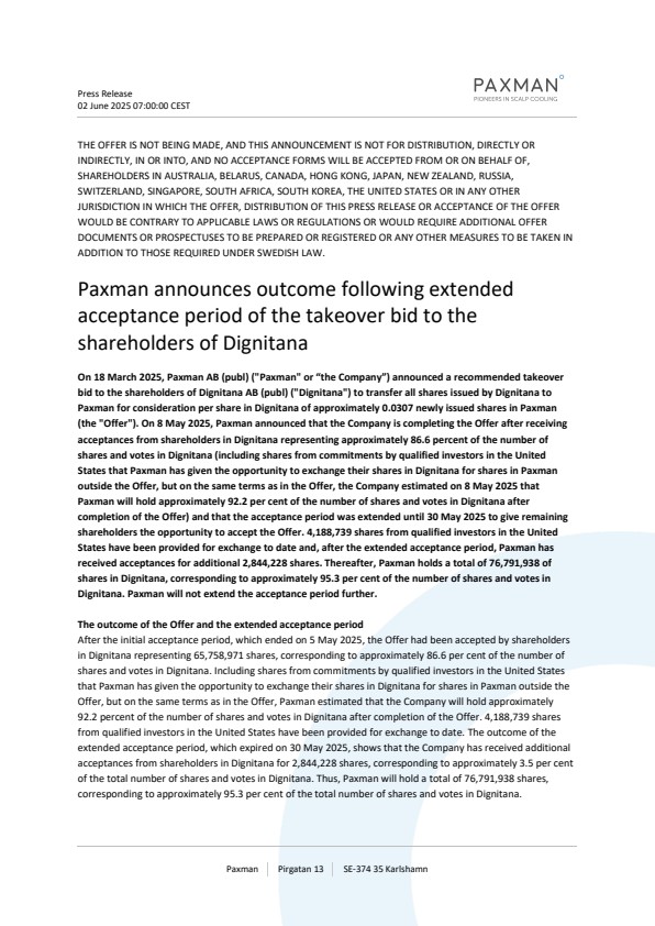 On 18 March 2025, Paxman AB (publ) ("Paxman" or “the Company”) announced a recommended takeover bid to the shareholders of Dignitana AB (publ) ("Dignitana") to transfer all shares issued by Dignitana to Paxman for consideration per share in Dignitana of approximately 0.0307 newly issued shares in Paxman (the "Offer"). On 8 May 2025, Paxman announced that the Company is completing the Offer after receiving acceptances from shareholders in Dignitana representing approximately 86.6 percent of the number of shares and votes in Dignitana (including shares from commitments by qualified investors in the United States that Paxman has given the opportunity to exchange their shares in Dignitana for shares in Paxman outside the Offer, but on the same terms as in the Offer, the Company estimated on 8 May 2025 that Paxman will hold approximately 92.2 per cent of the number of shares and votes in Dignitana after completion of the Offer) and that the acceptance period was extended until 30 May 2025 to give remaining shareholders the opportunity to accept the Offer. 4,188,739 shares from qualified investors in the United States have been provided for exchange to date and, after the extended acceptance period, Paxman has received acceptances for additional 2,844,228 shares. Thereafter, Paxman holds a total of 76,791,938 of shares in Dignitana, corresponding to approximately 95.3 per cent of the number of shares and votes in Dignitana. Paxman will not extend the acceptance period further.