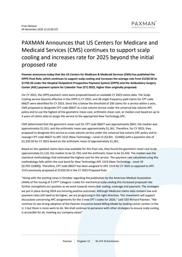 Paxman announces today that the US Centers for Medicare & Medicaid Services (CMS) has published the OPPS Final Rule, which continues to support scalp cooling and increases the average rate from $1250.50 to $1750.50 under the Hospital Outpatient Prospective Payment System (OPPS) and the Ambulatory Surgery Center (ASC) payment system for Calendar Year (CY) 2025, higher than originally proposed.