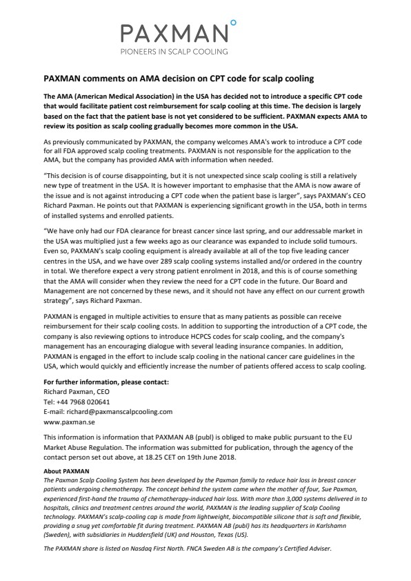 "We have only had our FDA clearance for breast cancer since last spring, and our addressable market in the USA was multiplied just a few weeks ago as our clearance was expanded to include solid tumours. Even so, PAXMAN's scalp cooling equipment is already available at all of the top five leading cancer centres in the USA, and we have over 289 scalp cooling systems installed and/or ordered in the country in total. We therefore expect a very strong patient enrolment in 2018, and this is of course something that the AMA will consider when they review the need for a CPT code in the future. Our Board and Management are not concerned by these news, and it should not have any effect on our current growth strategy", says Richard Paxman.
