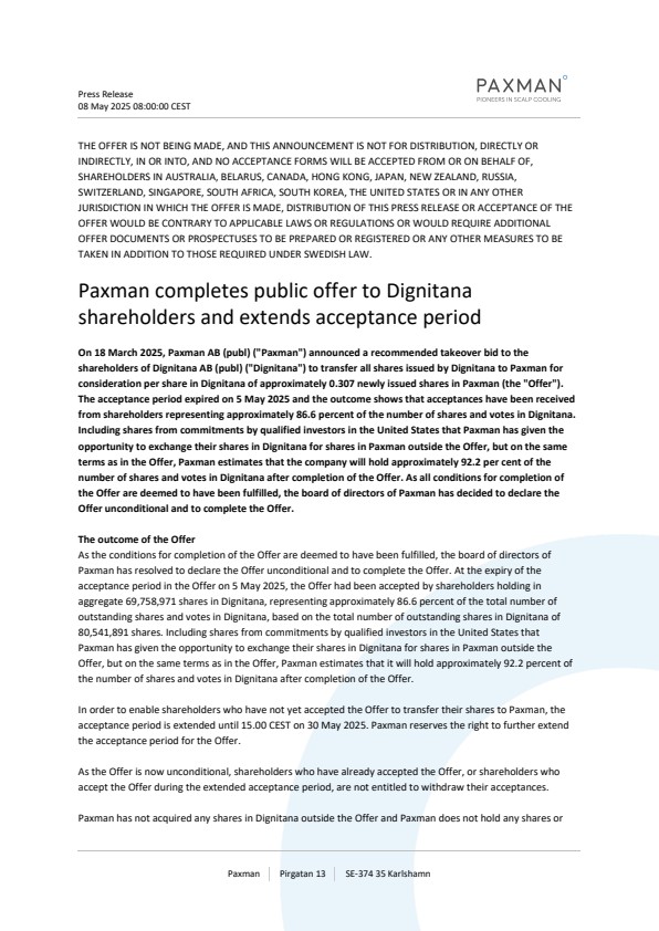 As the conditions for completion of the Offer are deemed to have been fulfilled, the board of directors of Paxman has resolved to declare the Offer unconditional and to complete the Offer. At the expiry of the acceptance period in the Offer on 5 May 2025, the Offer had been accepted by shareholders holding in aggregate 69,758,971 shares in Dignitana, representing approximately 86.6 percent of the total number of outstanding shares and votes in Dignitana, based on the total number of outstanding shares in Dignitana of 80,541,891 shares. Including shares from commitments by qualified investors in the United States that Paxman has given the opportunity to exchange their shares in Dignitana for shares in Paxman outside the Offer, but on the same terms as in the Offer, Paxman estimates that it will hold approximately 92.2 percent of the number of shares and votes in Dignitana after completion of the Offer.