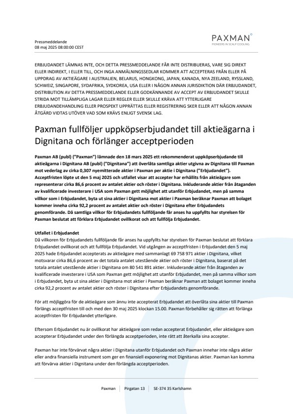 Paxman AB (publ) (”Paxman”) lämnade den 18 mars 2025 ett rekommenderat uppköpserbjudande till aktieägarna i Dignitana AB (publ) (”Dignitana”) att överlåta samtliga aktier utgivna av Dignitana till Paxman mot vederlag av cirka 0,307 nyemitterade aktier i Paxman per aktie i Dignitana (”Erbjudandet”). Acceptfristen löpte ut den 5 maj 2025 och utfallet visar att accepter har erhållits från aktieägare som representerar cirka 86,6 procent av antalet aktier och röster i Dignitana. Inkluderande aktier från åtaganden av kvalificerade investerare i USA som Paxman gett möjlighet att utanför Erbjudandet, men på samma villkor som i Erbjudandet, byta ut sina aktier i Dignitana mot aktier i Paxman beräknar Paxman att bolaget kommer inneha cirka 92,2 procent av antalet aktier och röster i Dignitana efter Erbjudandets genomförande. Då samtliga villkor för Erbjudandets fullföljande får anses ha uppfyllts har styrelsen för Paxman beslutat att förklara Erbjudandet ovillkorat och att fullfölja Erbjudandet.