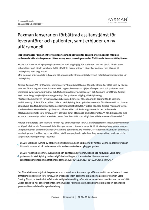 Företaget kommer även fortsättningsvis arbeta med stiftelser för ekonomiskt bistånd för de som inte kvalificerar sig till PAP, för att säkerställa att skalpkylning är ett prisvärt alternativ för alla som vill ha chansen att undvika den förödande bieffekten cellgiftsinducerat håravfall.” Vidare tillägger Richard ”Paxmans första kund som kontrakterade den nya buy and bill-modellen och PAP-programmet är det omfattande hälsovårdssystemet i New Jersey, och vi ser fram emot att många andra följer efter. Vi för diskussioner med ett antal communitys och akademiska centra över hela USA som vill gå över till denna nya affärsmodell.”