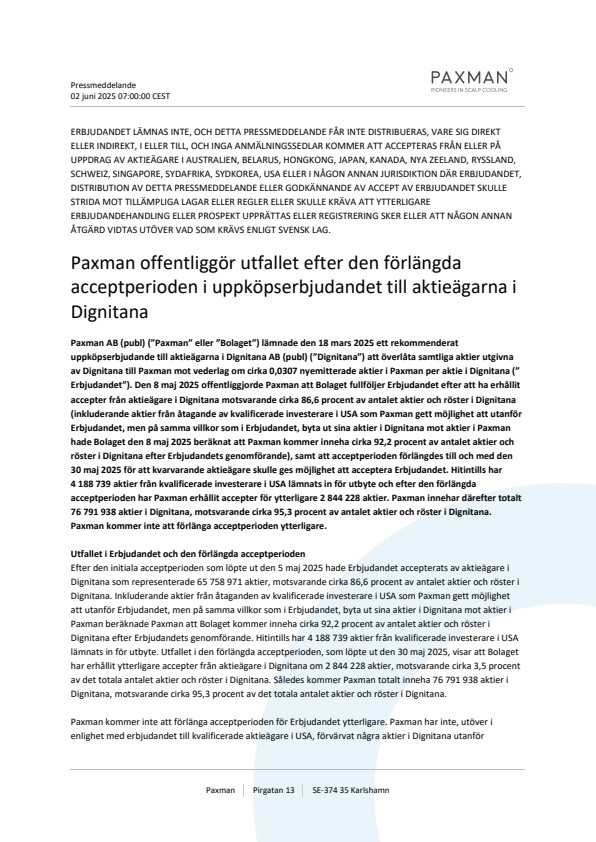 Paxman AB (publ) (”Paxman” eller ”Bolaget”) lämnade den 18 mars 2025 ett rekommenderat uppköpserbjudande till aktieägarna i Dignitana AB (publ) (”Dignitana”) att överlåta samtliga aktier utgivna av Dignitana till Paxman mot vederlag om cirka 0,0307 nyemitterade aktier i Paxman per aktie i Dignitana (”Erbjudandet”). Den 8 maj 2025 offentliggjorde Paxman att Bolaget fullföljer Erbjudandet efter att ha erhållit accepter från aktieägare i Dignitana motsvarande cirka 86,6 procent av antalet aktier och röster i Dignitana (inkluderande aktier från åtagande av kvalificerade investerare i USA som Paxman gett möjlighet att utanför Erbjudandet, men på samma villkor som i Erbjudandet, byta ut sina aktier i Dignitana mot aktier i Paxman hade Bolaget den 8 maj 2025 beräknat att Paxman kommer inneha cirka 92,2 procent av antalet aktier och röster i Dignitana efter Erbjudandets genomförande), samt att acceptperioden förlängdes till och med den 30 maj 2025 för att kvarvarande aktieägare skulle ges möjlighet att acceptera Erbjudandet. Hitintills har 4 188 739 aktier från kvalificerade investerare i USA lämnats in för utbyte och efter den förlängda acceptperioden har Paxman erhållit accepter för ytterligare 2 844 228 aktier. Paxman innehar därefter totalt 76 791 938 aktier i Dignitana, motsvarande cirka 95,3 procent av antalet aktier och röster i Dignitana. Paxman kommer inte att förlänga acceptperioden ytterligare.