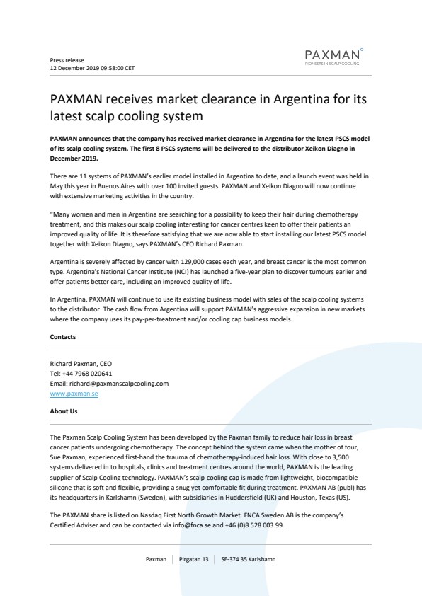 PAXMAN announces that the company has received market clearance in Argentina for the latest PSCS model of its scalp cooling system. The first 8 PSCS systems will be delivered to the distributor Xeikon Diagno in December 2019.