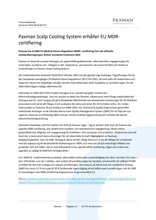 Alexandra Sheldrake, chef för kvalitet och drift på Paxman säger: "Jag är oerhört stolt över att Paxman har uppnått MDR-certifiering, och särskilt över kvalitets- och teknikteamens engagemang, hårda arbete, genomförda due diligence och engagemang för kvaliteten i våra processer och produkter. Tillsammans som ett team har vi övervunnit stora utmaningar för att säkerställa fortsatt tillgänglighet av Paxmans skalpkylningsenhet. Som ett SME- företag är detta särskilt viktigt eftersom vi vet att många har misslyckats med att anpassa sig till de betydande förändringarna i MDR, och vissa har till och med dragit tillbaka sina produkter helt och hållet. Det är med ödmjukhet vi har uppnått MDR-certifiering, något som erkänt har uppnåtts av väldigt få MedTech-företag hittills.”