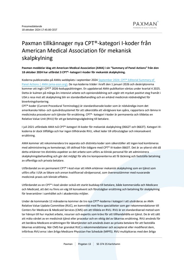 Paxman meddelar idag att American Medical Association (AMA) i sin “Summary of Panel Actions” från den 18 oktober 2024 har utfärdat 3 CPT®- kategori I-koder för mekanisk skalpkylning.