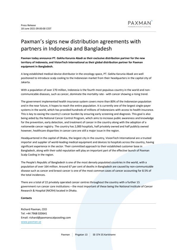 Headquartered in the capital of Dhaka, the largest city in the country, VisionTech International are a trusted importer and supplier of world-leading medical equipment and devices to hospitals across the country, having significant experience in the sector. Their committed approach to their established customer base in Bangladesh, along with their solid reputation will play an important part of the effective launch of Paxman Scalp Cooling in the region.