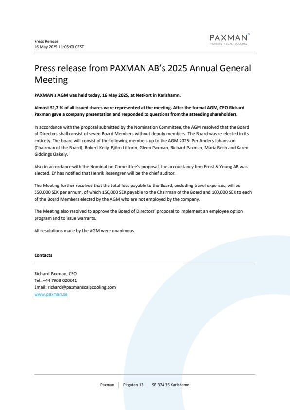 PAXMAN´s AGM was held today, 16 May 2025, at NetPort in Karlshamn.