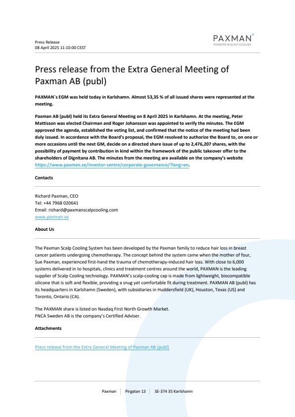 Paxman AB (publ) held its Extra General Meeting on 8 April 2025 in Karlshamn. At the meeting, Peter Mattisson was elected Chairman and Roger Johansson was appointed to verify the minutes. The EGM approved the agenda, established the voting list, and confirmed that the notice of the meeting had been duly issued. In accordance with the Board's proposal, the EGM resolved to authorize the Board to, on one or more occasions until the next GM, decide on a directed share issue of up to 2,476,207 shares, with the possibility of payment by contribution in kind within the framework of the public takeover offer to the shareholders of Dignitana AB. The minutes from the meeting are available on the company’s website https://www.paxman.se/investor-centre/corporate-governance/?lang=en.
