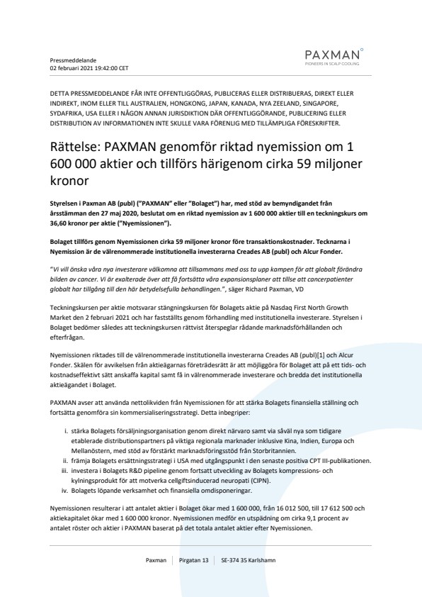 Styrelsen i Paxman AB (publ) (”PAXMAN” eller ”Bolaget”) har, med stöd av bemyndigandet från årsstämman den 27 maj 2020, beslutat om en riktad nyemission av 1 600 000 aktier till en teckningskurs om 36,60 kronor per aktie (”Nyemissionen”).