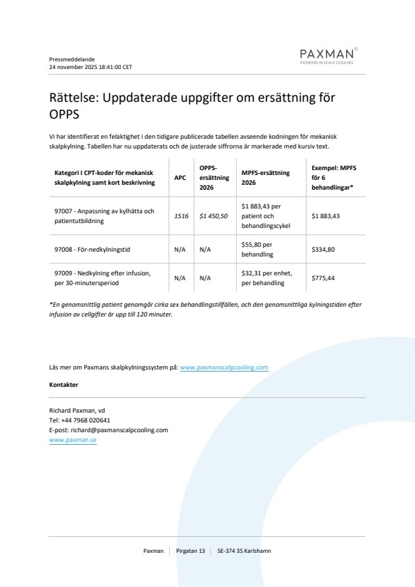 | Kategori I CPT-koder för mekanisk skalpkylning samt kort beskrivning | APC | OPPS-ersättning 2026 | MPFS-ersättning 2026 | Exempel: MPFS för 6 behandlingar* |