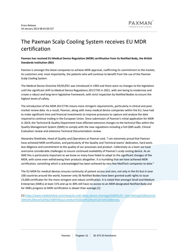Alexandra Sheldrake, Head of Quality and Operations at Paxman said, “I am extremely proud that Paxman have achieved MDR certification, and particularly of the Quality and Technical teams’ dedication, hard work, due diligence and commitment to the quality of our processes and product. Collectively as a team we have overcome considerable challenges to ensure continued availability of Paxman’s scalp cooling device. As an SME this is particularly important as we know so many have failed to adapt to the significant changes of the MDR, with some even withdrawing their products altogether. It is humbling that we have achieved MDR certification, something which is acknowledged has been achieved by very few MedTech companies to date.”